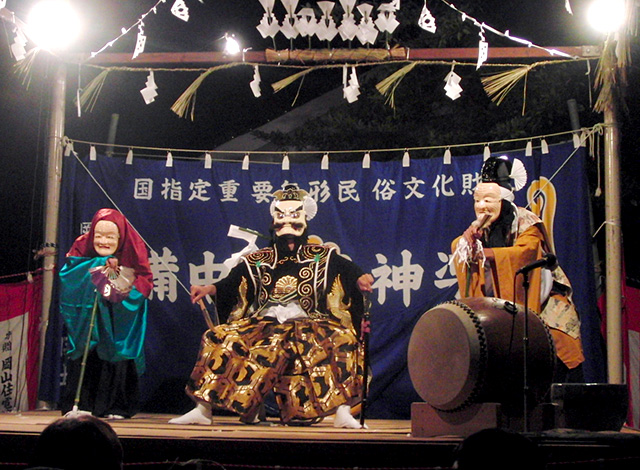 江戸時代末期に日名村(現在の高梁市成羽町)の神官をしていた西林国橋は、それまでの土俗的な荒神神楽に代わって、「古事記」や「日本書紀」の神話に題材を求めた「神代神楽」を創案。それまでにないダイナミックでストーリー性豊かな神話劇は一気に人々の心をとらえ、「備中神楽」の名を高める契機となりました。現在も備中地方全域で広く親しまれており、五穀豊穣を祈るために、また、秋祭りのクライマックスを飾る庶民の娯楽として、夜を徹して舞われています。昭和31年岡山県重要無形民俗文化財に指定され、昭和54年には国の重要無形民俗文化財の指定を受けました。